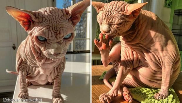 셰르단은 다른 스핑크스 고양이들에 비해 주름이 많고 움푹 파여 있어 매우 화가 난 것처럼 보인다.