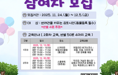 [노트펫] 경기 김포시는 오는 12월 5일까지 반려견의 건강증진과 보호자와의 유대감 강화를 위해 반려문화교육 '댕댕 체육교실' 참여자를 모집한다고 25일 밝혔다.