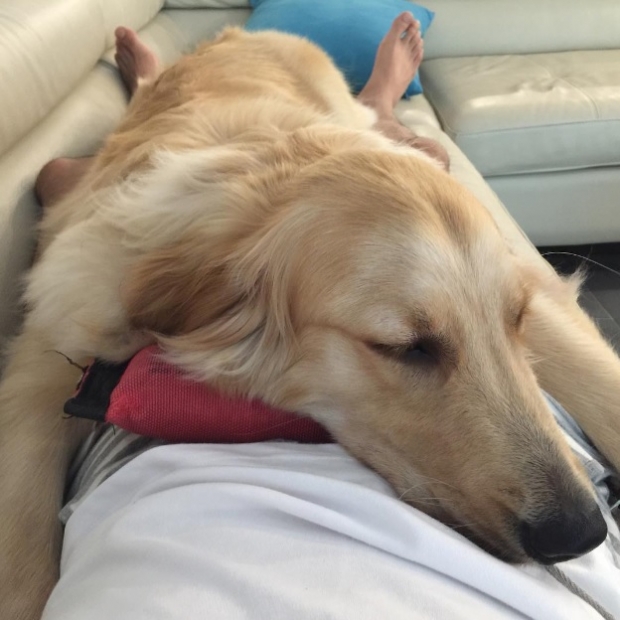 지난 2일 가수 이정신이 자신의 하체 길이만큼 길고 큰 체구를 자랑하는 반려견 골든 리트리버 심바와의 다정한 사진을 공개했다.