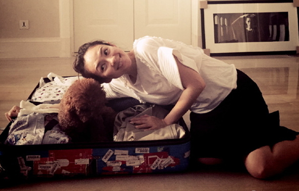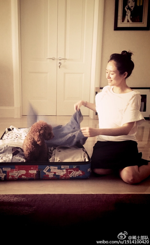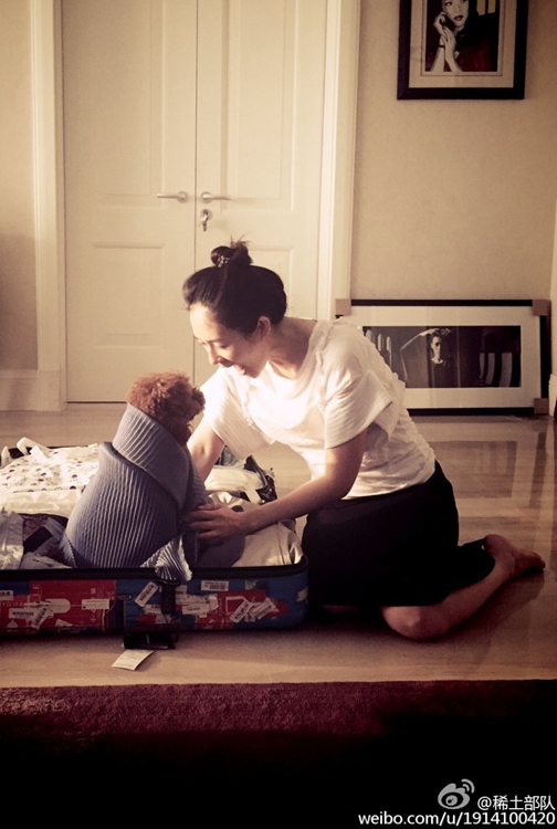 사진 속의 장쯔이는 해외 일정을 위해 짐을 꾸리고 있다. 반려견과 함께 짐을 싸는 모습이 매우 즐거워 보인다.