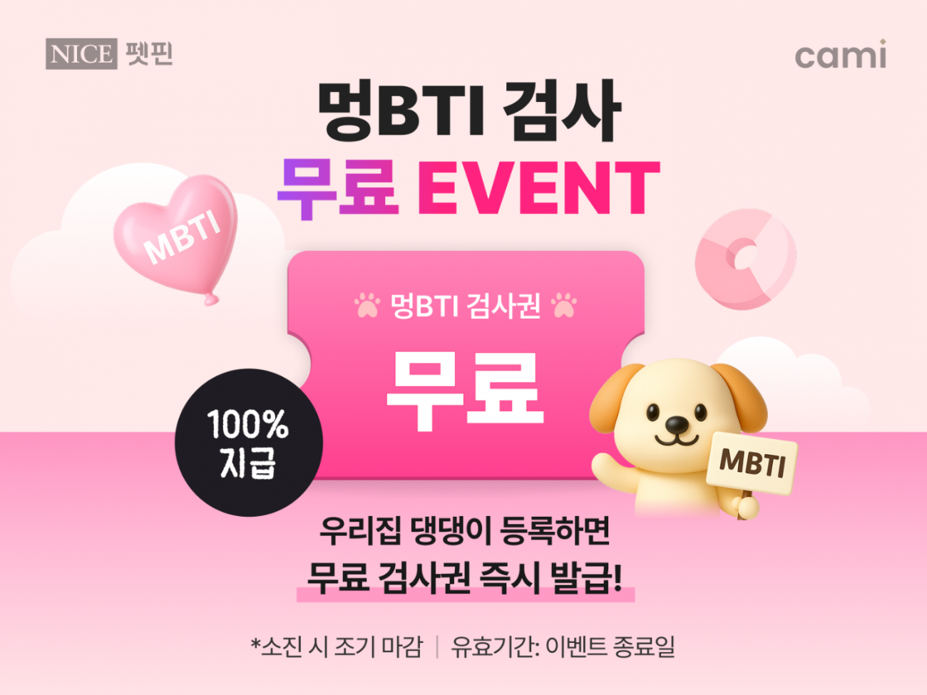 18일 NICE아이핀에 따르면 이번 이벤트는 반려동물과 보호자가 함께 참여할 수 있는 참여형 프로그램으로, 이벤트 기간 동안 펫핀에서 반려견 정보를 입력하면 1만 2천 원 상당의 '반려견 성격 유형 진단(MBTI)' 서비스를 무료로 제공한다. 본 이벤트는 반려견의 성격과 행동을 이해하고, 보다 건강하고 책임 있는 반려 문화를 확산하기 위해 기획됐다.