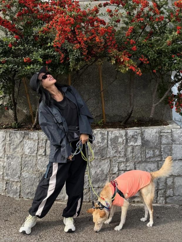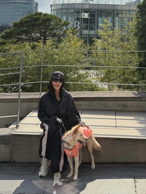 공개된 사진 속에서 엄정화는 둘만의 여유로운 산책을 즐기고 있다.