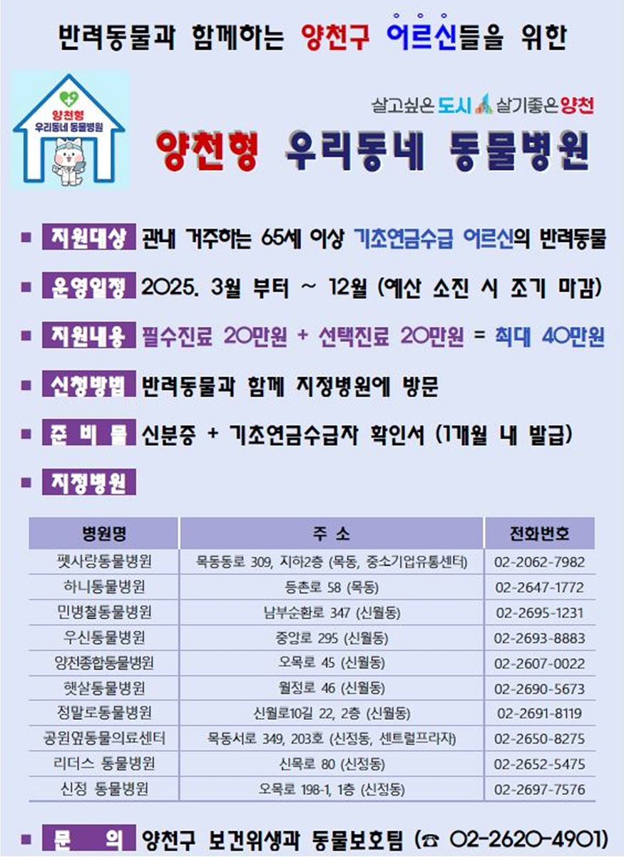 구에 따르면, '양천형 우리동네 동물병원'은 지난 2023년 구가 서울시 자치구 중 처음으로 시행한 특화사업이다. 고령인구가 늘어나면서 반려동물을 벗 삼아 지내는 어르신이 늘어나는 추세를 반영해 병원비 부담 경감과 동물복지 증진에 기여하고자 도입했다. 시행 3년 차인 올해까지 반려동물 총 2백여 마리가 이 사업을 통해 진료비 지원을 받았다.