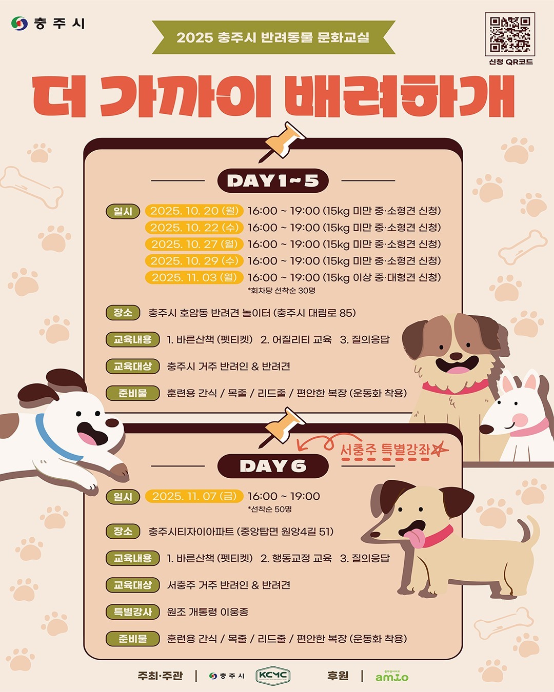 6회차는 충주시티자이 아파트에서 특별 강좌로 진행된다. 공동주택 내 반려 예절과 올바른 반려 문화를 집중적으로 다룬다. 선착순 50명까지 참여할 수 있다.