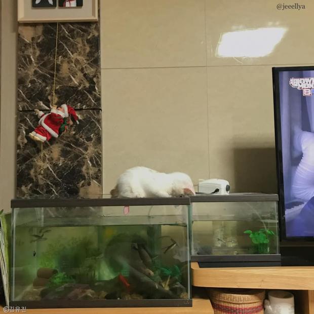 이어 "그런데 제가 학교에 가 있을 때, 엄마가 젤리가 어항 위에 올라가 물을 마시는 걸 발견하고 걱정을 하셨다"며 "전 사고뭉치 젤리가 마냥 귀엽다는 생각만 하고 있었는데, 어느 날 제가 볼 때 저렇게 어항 위에 올라가 얼굴을 파묻고 한참을 쳐다보고 있길래 너무 귀여워 밥 먹다 말고 바로 사진을 찍게 됐다"고 덧붙였다.