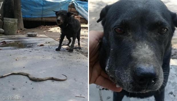 강아지는 코브라에게 입을 물렸는지 얼굴이 부은 상태였고 침을 질질 흘리고 있었다.