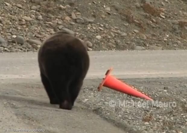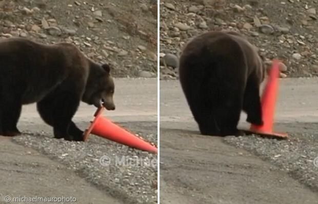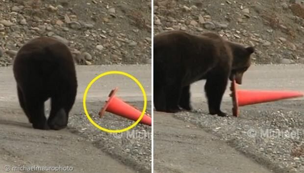 도로 옆에 세워져 있는 안전콘을 본 앞서가던 곰은 그것을 앞발로 툭 쳐서 넘어뜨렸다. 이후 녀석은 흥미를 잃었는지 바로 자리를 떴다.