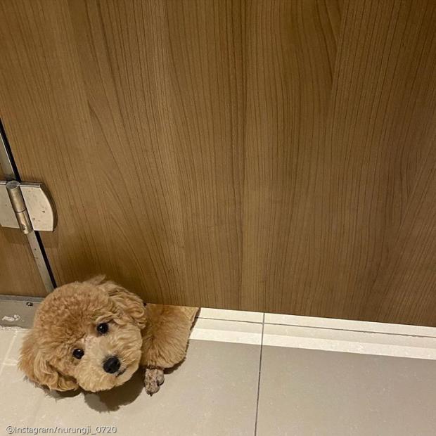 반려견 '누룽지(이하 룽지)'의 보호자는 SNS에 "화장실까지 쫓아오는 스토커"라는 글과 함께 한 장의 사진을 게재했다.