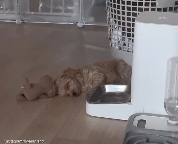 영상에는 반려견 '화랑이'가 자동 급식기 옆에 누워 자고 있는 모습이 보이는데.