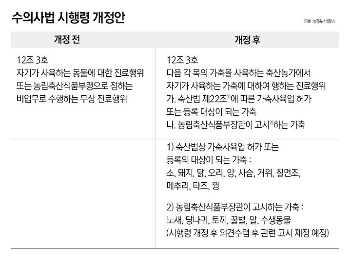 그래서 시행령 제12조 제3호 ‘자기가 사육하는 동물에 대한 진료행위’에 새로운 조항 2개를 추가합니다.